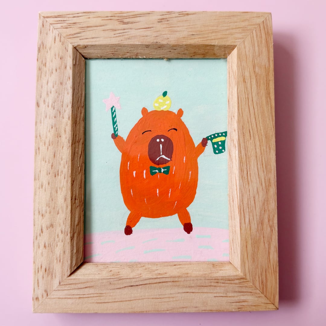ミニ原画《サーカスカピバラ》/木製フレーム付き/アクリル絵の具/2025年